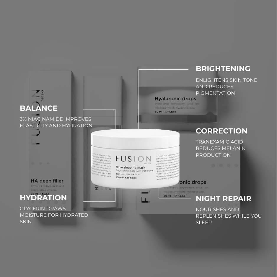 The Glow Sleeping Mask is an innovative overnight treatment from Fusion Meso designed to maximize the skin's natural repair cycle during sleep, delivering intensive hydration, detoxification, and a visible boost in radiance. This mask targets the critical relationship between skin health and its natural environment, relying on a blend of cutting-edge active ingredients.