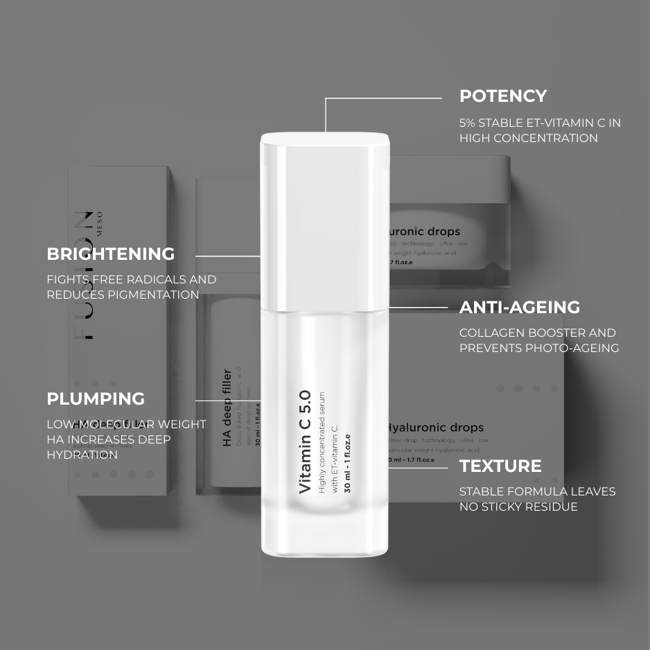 The Vitamin C 5.0 is a highly concentrated serum featuring 5% ET-vitamin C and Hyaluronic acid XS. It targets pigmentation, brown spots, and photo-ageing. It functions as a powerful anti-oxidant, neutralizing free radicals, boosting collagen, and evening out skin tone.