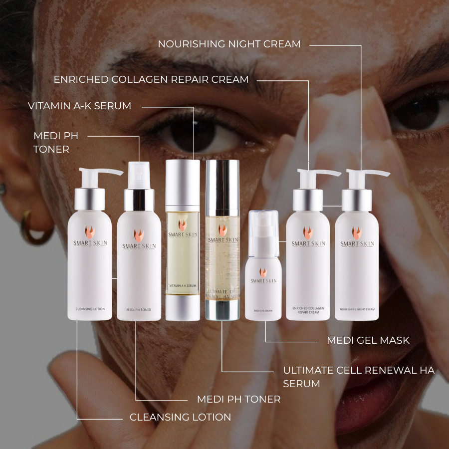 Cleansing Lotion: Tocopheryl Acetate, Retinyl Palmitate, Persea Gratissma. Medi PH Toner: Vitamin B2, Linoleic Acid. Ultimate Cell Renewal Serum: 91% Aloe Ferox, 6% Probiotic, 3% HA. Vitamin A-K Serum: Vitamins A-K, Tocopheryl Acetate, Persea Gratissma, Squalane. Medi Eye Cream: Marigold, Tea Tree, Simmondsia Chinensis, Camellia Sinensis. Enriched Collagen Repair Cream: Soluble Collagen, Hydrolyzed Elastin, Vitamins. Nourishing Night Cream: Lecithin, Vitamins A, E, D, C.
