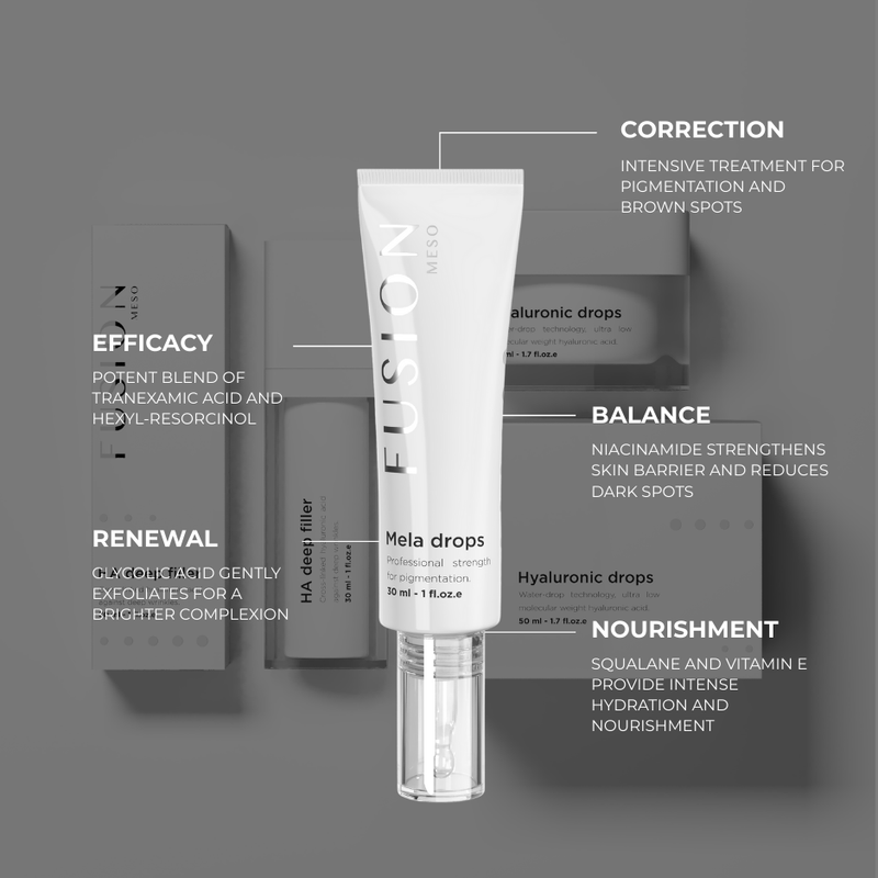 The Mela Drops serum is a highly concentrated, advanced skin-brightening solution from Fusion Meso, meticulously formulated to combat hyperpigmentation, brown spots, and uneven skin tone. The product’s efficacy stems from a sophisticated blend of three key active ingredients, all working synergistically to inhibit melanin production and promote skin renewal.